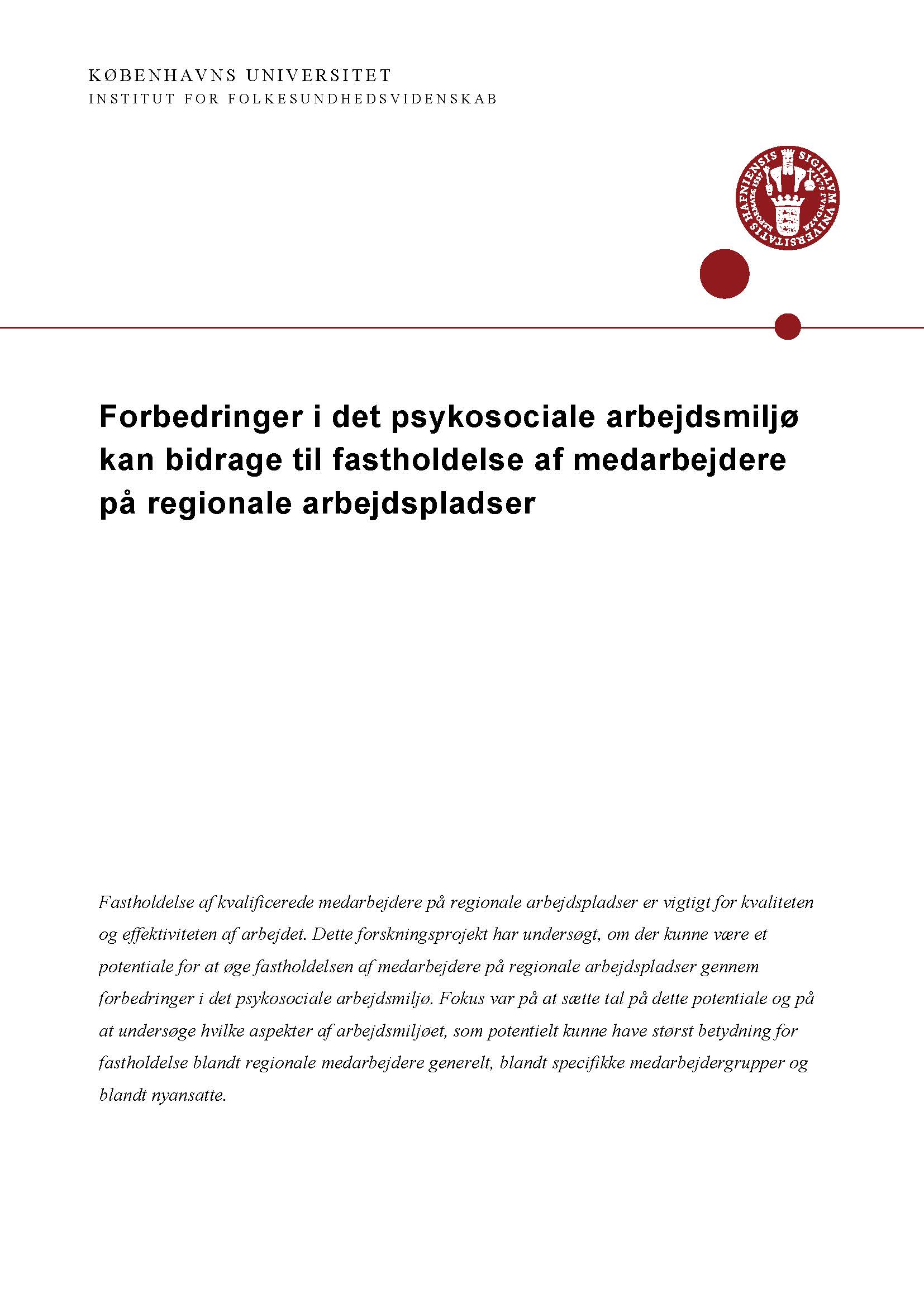 Dette forskningsprojekt har undersøgt, om der kunne være et potentiale for at øge fastholdelsen af medarbejdere på regionale arbejdspladser gennem forbedringer i det psykosociale arbejdsmiljø. Fokus var på at sætte tal på dette potentiale og på at under-søge hvilke aspekter af arbejdsmiljøet, som potentielt kunne have størst betydning for fastholdelse blandt regionale medarbejdere generelt, blandt specifikke medarbejder-grupper og blandt nyansatte.